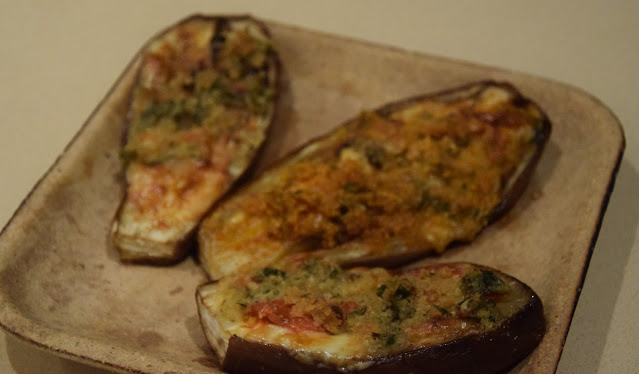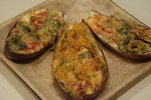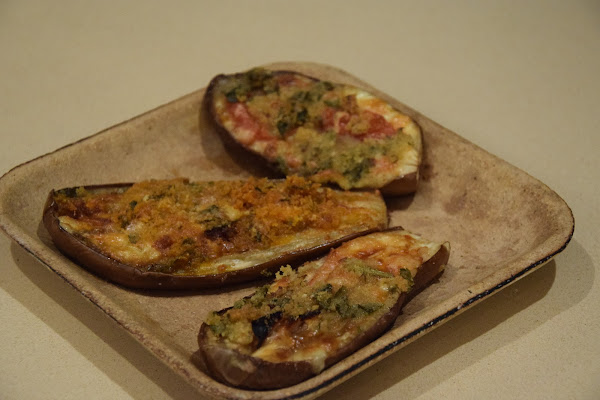 En cada berenjena rellenar los cortes que habéis hecho, con las tiras del relleno elegido.
