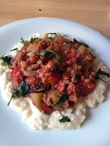 Calentamos el aceite en una sartén a fuego medio y añadimos la cebolla, la hoja de laurel y un poquito de sal y cocinamos dándolo vueltas unos 7 minutos, hasta que la cebolla esté hecha y dorada. Añadimos el ajo y el chile y cocinamos un par de minutos más. Echamos los tomates y el vinagre y seguimos cocinando otros 7 minutos más, moviéndolo de vez en cuando. Añadimos las berenjenas que tenemos reservadas, mezclamos bien. Dejamos unos minutos más antes de añadir las lentejas y 100 ml de agua. Dejamos cocer hasta que el agua se haya evaporado casi por completo. Sazonamos