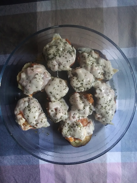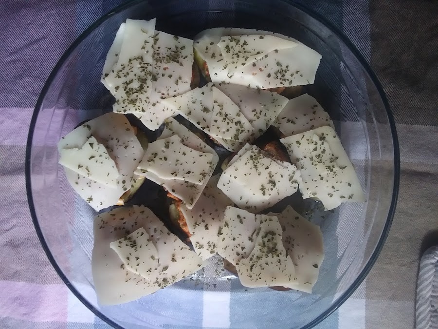 Las sacamos y coronamos con el pisto, el queso y las hierbas. Metemos en el micro 5 minutos más.