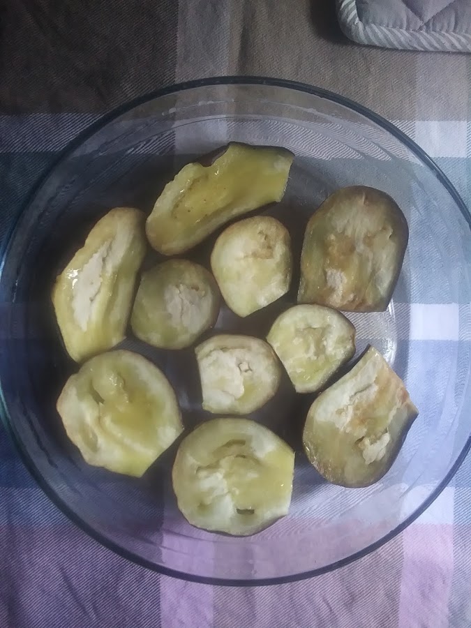 Quitamos las puntas a las berenjenas y las cortamos por la mitad horizontalmente. Las disponemos en un recipiente apto para microondas con el corte hacia arriba. Ponemos un hilo de aceite y sal y las metemos 5 minutos en el micro a unos 750w (máx. potencia).