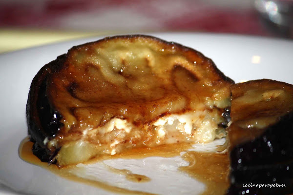 Colocamos una rodaja de berenjena, una de queso de cabra, berenjena, queso y por último de nuevo berenjena, rociamos con un poco de miel y listo.