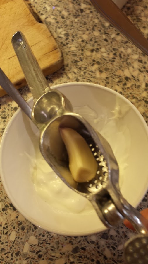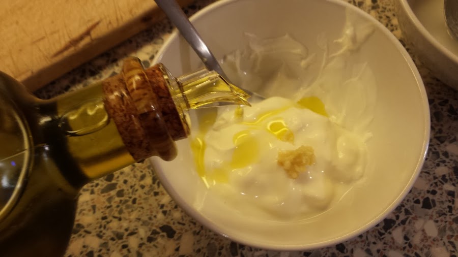 Mientras tanto preparamos la salsa mezclando el yogur griego con 8 cucharadas de buttermilk, el ajo prensado, una cucharada de aceite de oliva y un poco de sal. Reservamos.