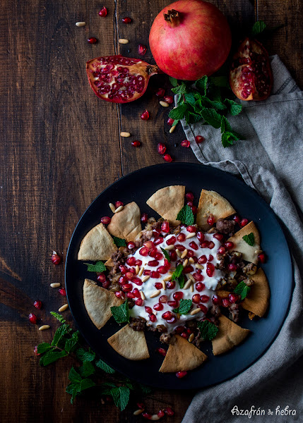En el plato colocar una base de trozos de pan de pita tostado, a continuación una capa de berenjena con la carne, cubrir con la salsa de yogur y por último espolvorear los granos de granada, los piñones tostados y la menta picada.
