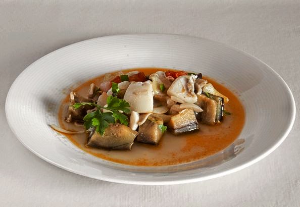 Retiramos el exceso de aceite, agregamos las berenjenas, la sepia, las hojas de laurel y el pimentón y rehogamos un par de minutos.
