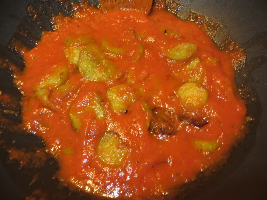 Lo primero es elaborar el tomate frito casero, en el siguiente enlace podéis encontrar la receta casera de mi madre que con los tomates del huerto está para chuparse los dedos: http://lacucharaenlamaleta.blogspot.com.es/2013/02/macarrones-al-estilo-moni.html.