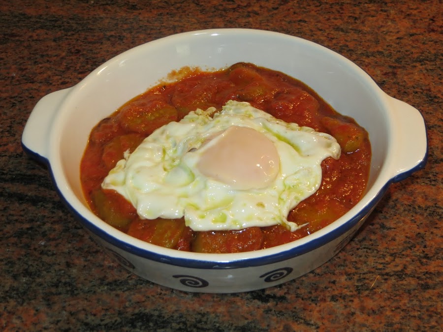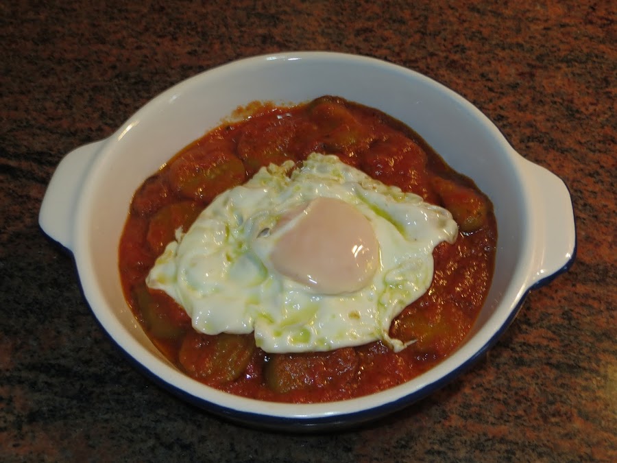 En otra sartén calentáis el tomate y cuando tengáis las berenjenas listas las añadís, lo dejáis cocer todo junto cinco minutos. Mientras tanto en otra sartén freís los huevos. A la hora de montar el plato colocáis las berenjenas con tomate en el fondo del plato y lo coronamos con el huevo y ya está listo para comer.