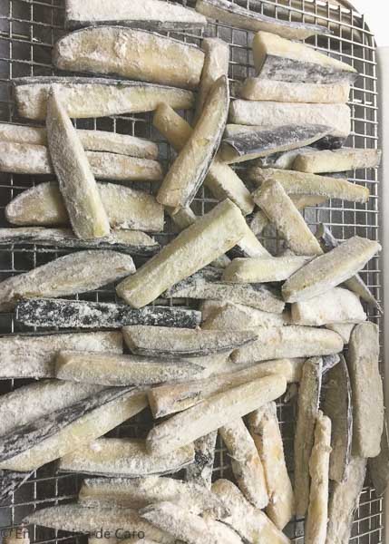 Dejamos otra media hora, escurrimos, secamos bien y las colocamos en una bolsa de ziploc con harina, no todas a la vez, así se cubren bien con la harina, es importante hacer esto casi al momento de freír, para que no se humedezca la harina. Mientras terminaba de enharinar todas las fui poniendo en una rejilla.