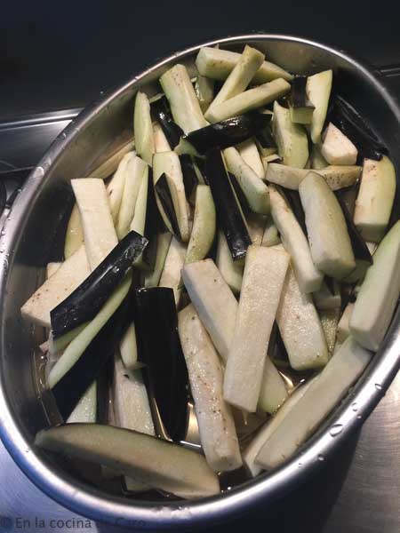 Colocamos en un colador una capa de berenjenas, sal fina, otra capa de berenjenas y de nuevo sal, así hasta terminar las berenjenas. Las dejamos con sal al menos media hora, de esta forma sueltan el amargo.