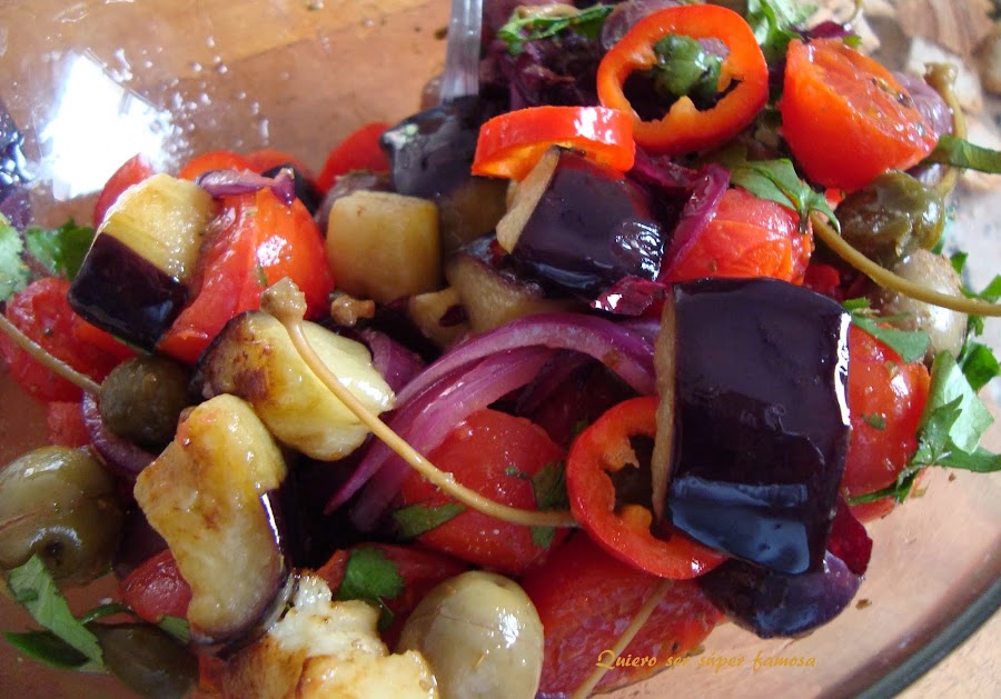 Colocar las berenjenas, la cebolla y el tomate en un bol. Añadir las aceitunas deshuesadas, las alcaparras, y el mini pimiento dulce a rodajas, si lo habéis elegido.