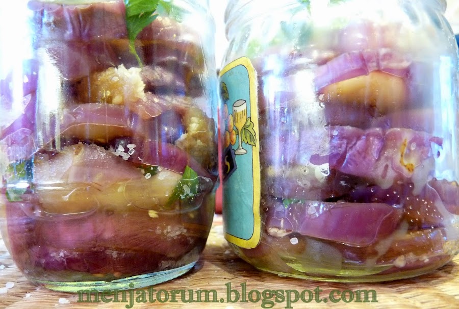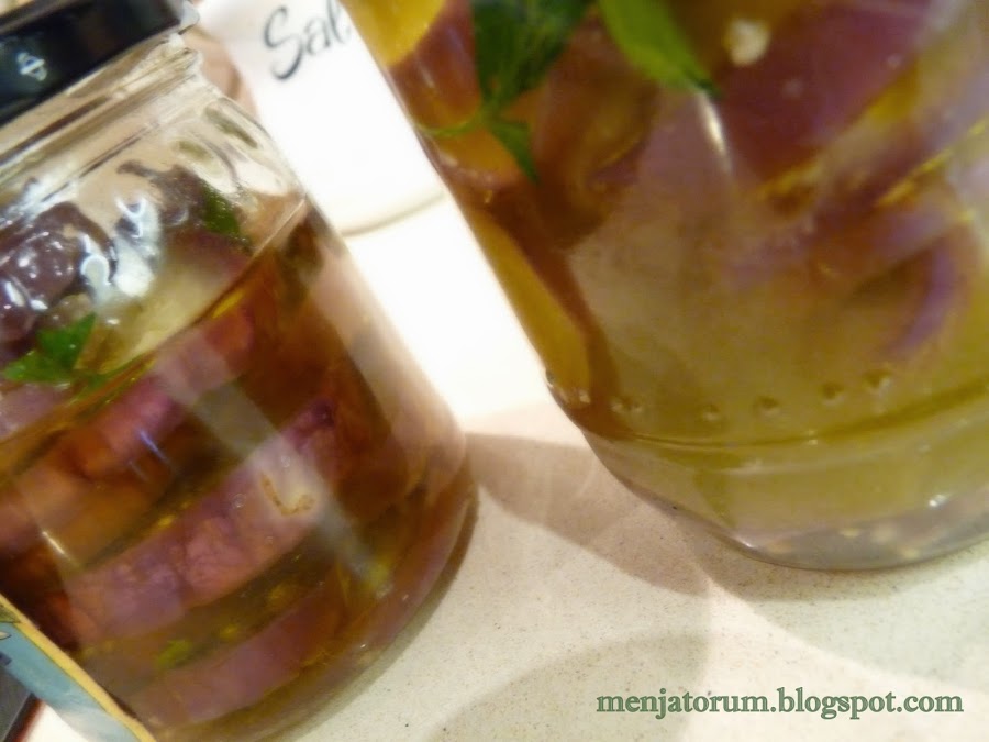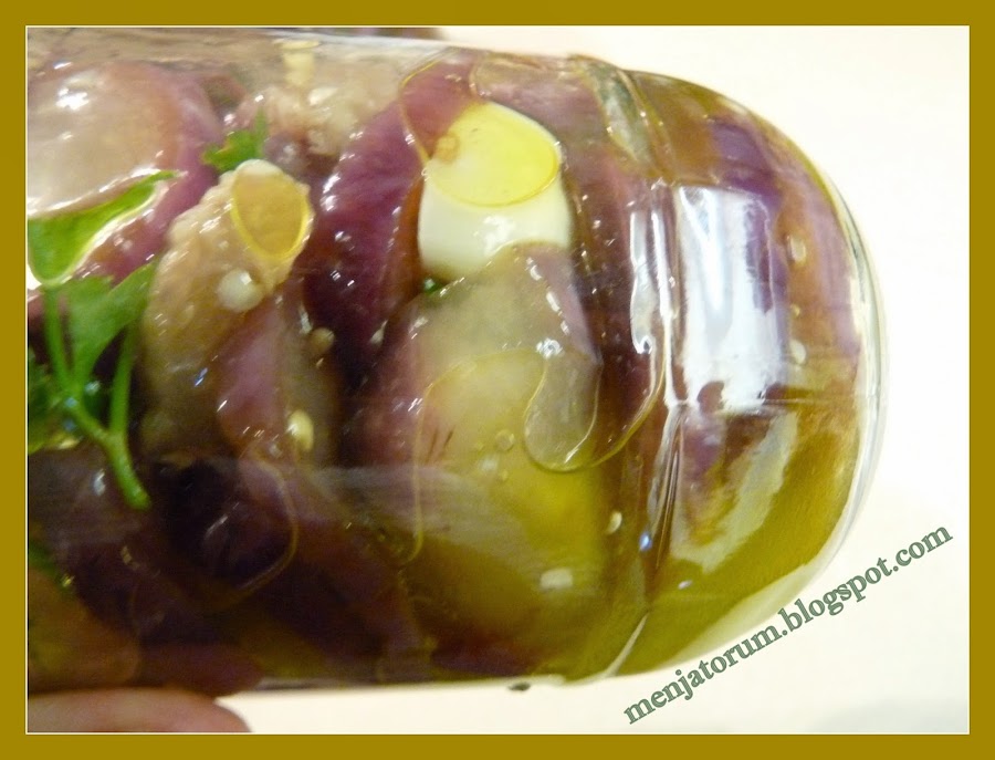 Colocamos las rodajas en los tarros de cristal por capas, en el fondo en la primera capa,espolvoreamos la pimienta,orégano, una hoja de laurel y un ajo machacado y un poco del caldo que han soltado en el escurridor,seguimos añadiendo berenjenas hasta arriba y por últímo otro ajo y el perejil en rama.Termino añadiendo el aceite hasta cubrir.Tapamos los botes y giramos al revés una hora.