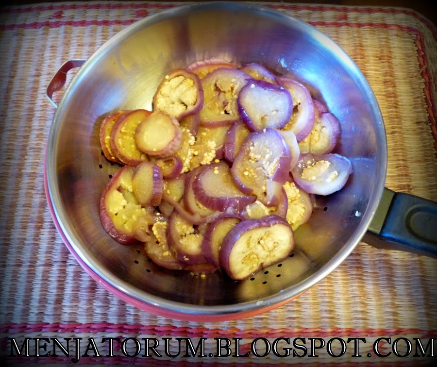 Primero cortamos las berenjenas en rodajas las colocamos en un escurridor y espolvoreamos con sal gorda, las dejamos reposar una hora.Las pasamos por agua y escurrimos.