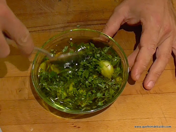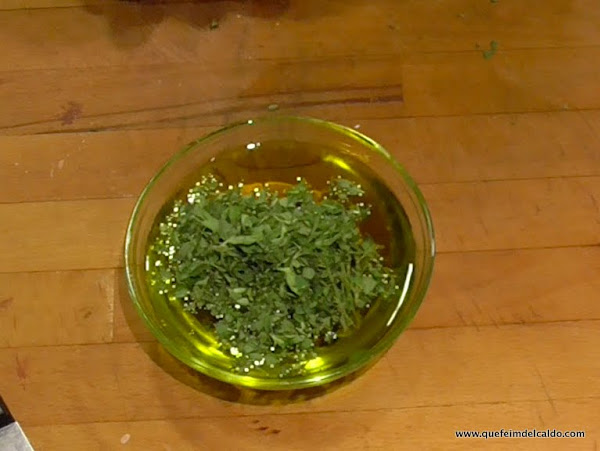 En un recipiente colocamos el aceite de oliva y junto a este ponemos el orégano fresco picado.