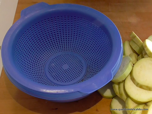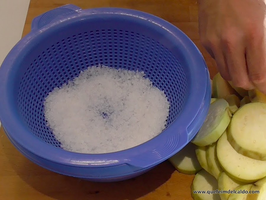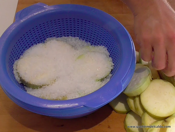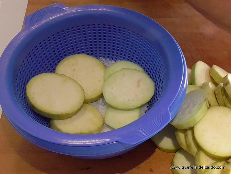 Dejamos reposando durante 1,5 horas o 2 horas para que las berenjenas tiren el agua y con ella el amargor que poseen.