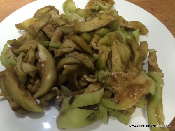 Una vez templadas las berenjenas colocamos el aliños que hemos realizado sobre ellas y lo mezclamos con una cuchara.
