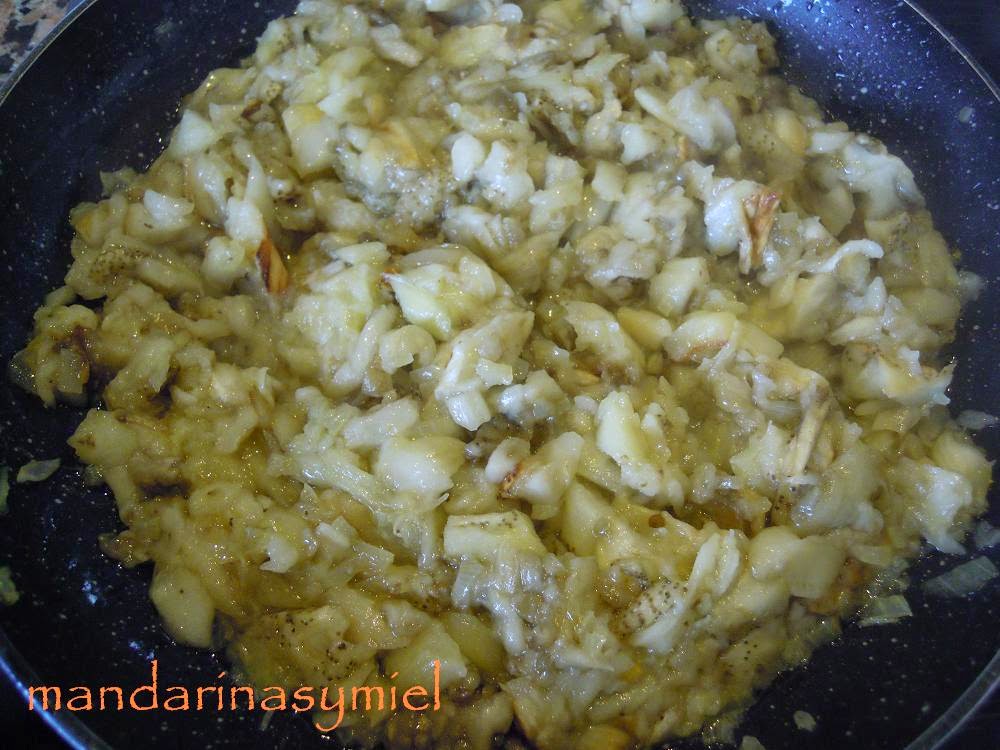 En una sartén con aceite, sofríe la cebolla, cuando esté medio pochada añade la berenjena y deja cocer unos 10 minutos, pon el zumo del limón.