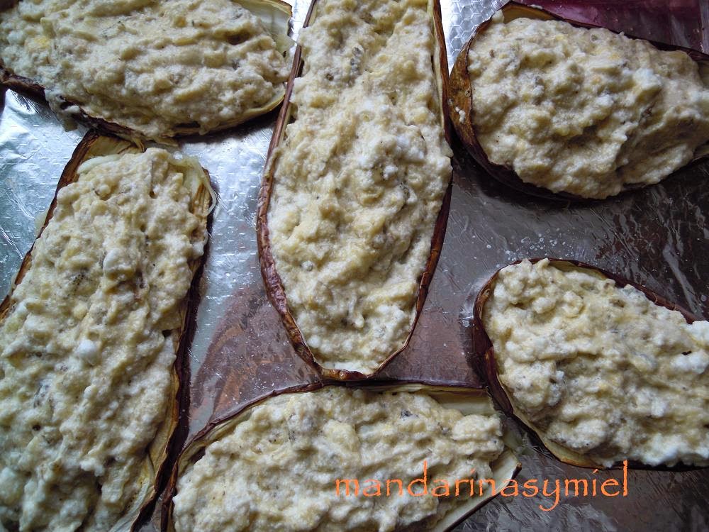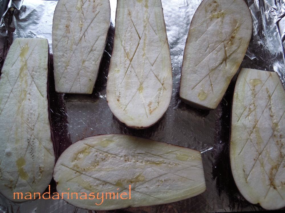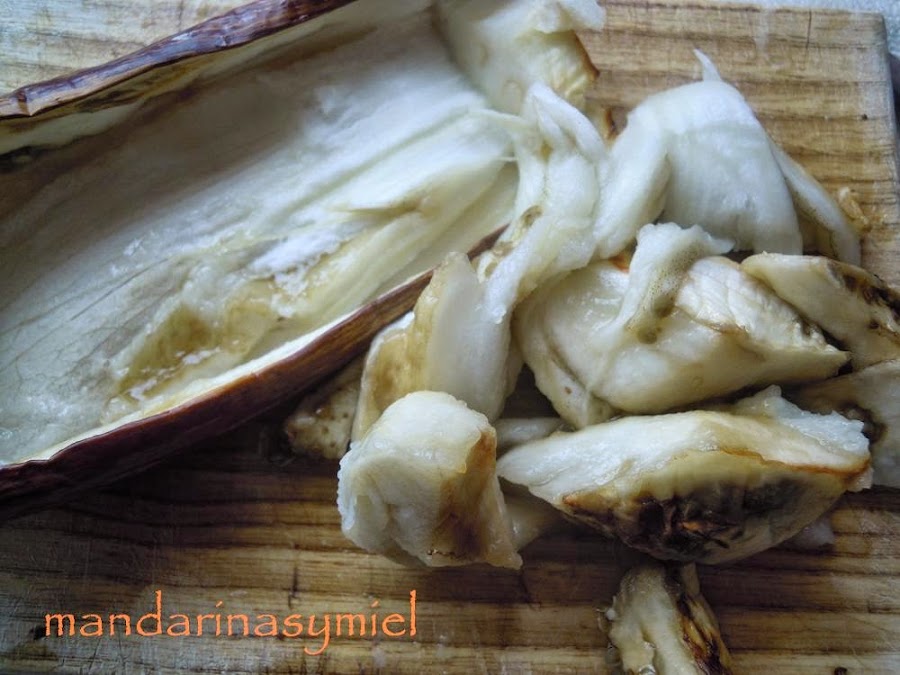 Mete en el horno precalentado a 200º unos 15 minutos o hasta que veas que están algo tiernas. Cuando estén cocidas, saca, deja que se enfríen un poco y con la ayuda de una cucharita, saca toda la carne de la berenjena, pícala y reserva.