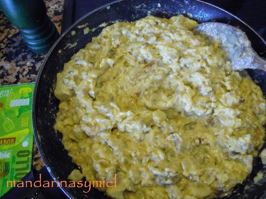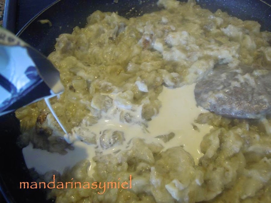 Echa la cucharada de harina, mezcla y añade la nata (crema de leche), deja que se saltee todo junto 5 minutos.