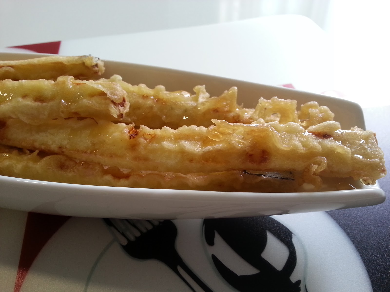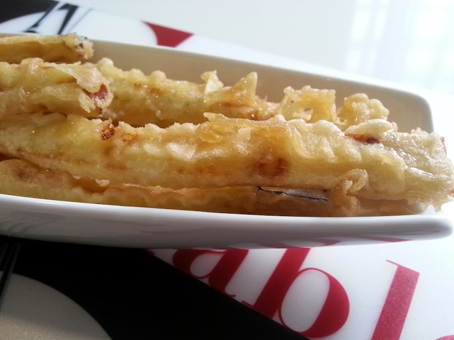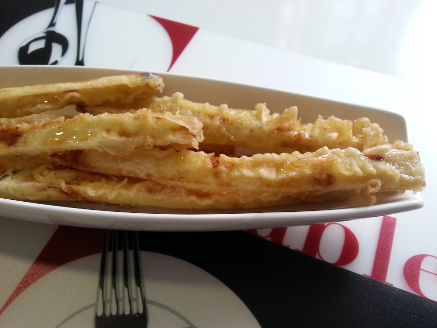 3. - Escurrimos las berenjenas, pasamos por papel absorbente, y pasamos por la tempura.
