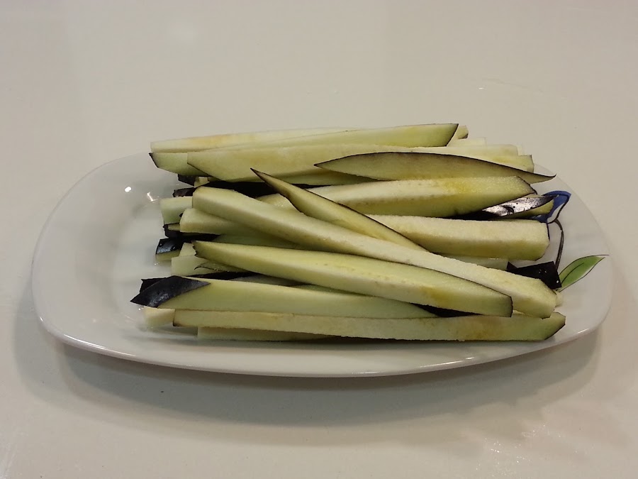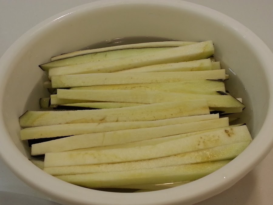 1. - Cortamos la berenjena en tiritas y metemos en agua con sal, al menos una hora.