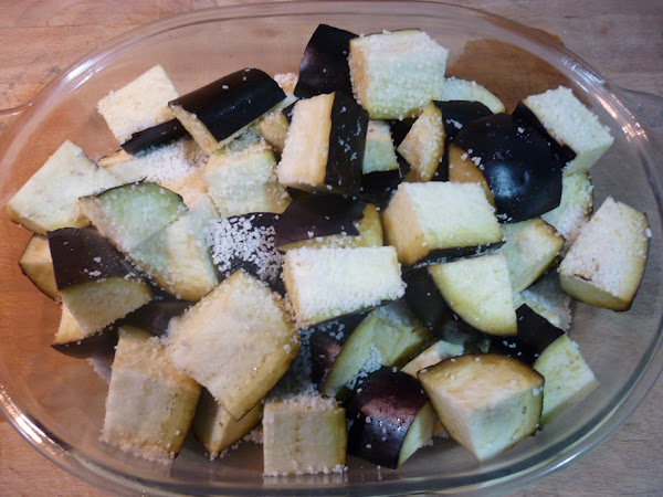 Cortamos las berenjenas en trozos del tamaño de un bocado y las dejamos en un recipiente con sal gorda durante media hora.