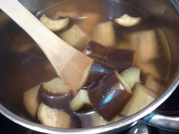 Al día siguiente, las berenjenas se habrán ablandado un poco más. Retiramos casi toda el agua de la cocción dejando un poco (como un dedo) en el fondo.