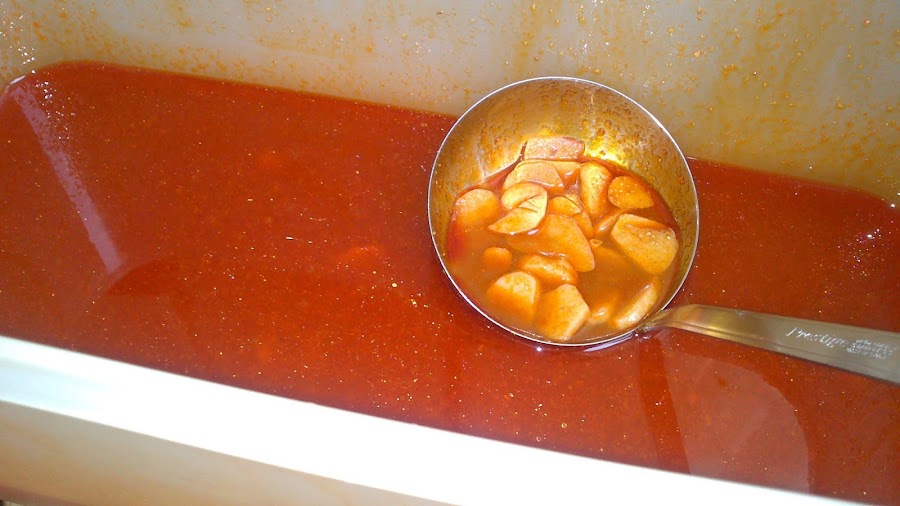 Una vez estén cocidas las berenjenas las añadimos al aliño y le añadimos agua hasta cubrirlas, como veis en la foto.