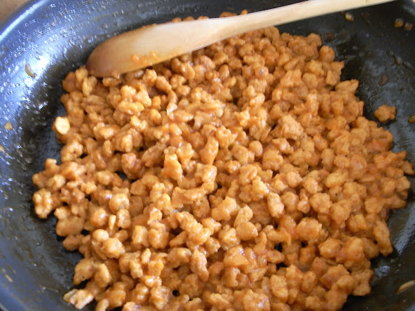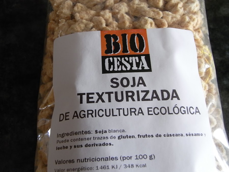 Para prepararla sólo hay que hervir agua y añadir la soja texturizada, apartamos del fuego, tapamos y dejamos reposar 10 minutos para que se hidrate, Se vuelca en un colador y se refresca bajo el grifo. Se escurre bien y lista para freír, hornear o lo que queramos. Hay que tener en cuenta que la soja por sí misma no tiene mucho sabor y es importante condimentarla con lo que nos guste: salsas, hierbas o especias ... yo como tengo un bote de garam masala que compré pues le pongo una cucharadita pero no es un ingrediente principal.