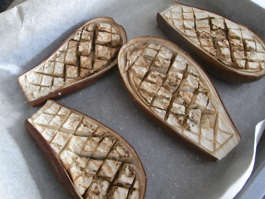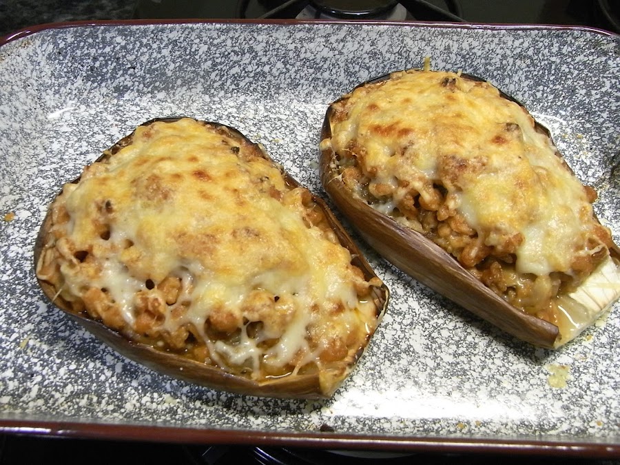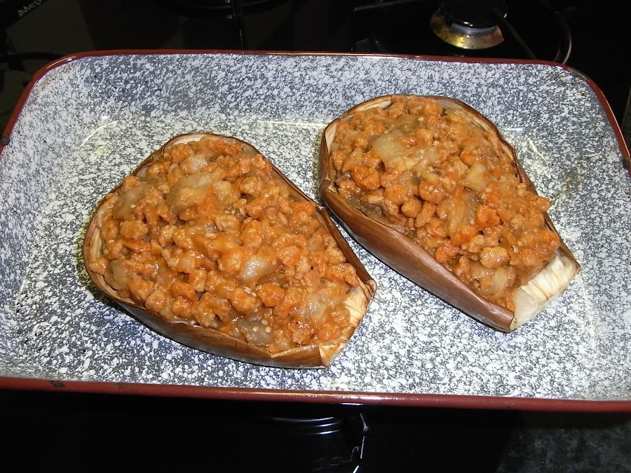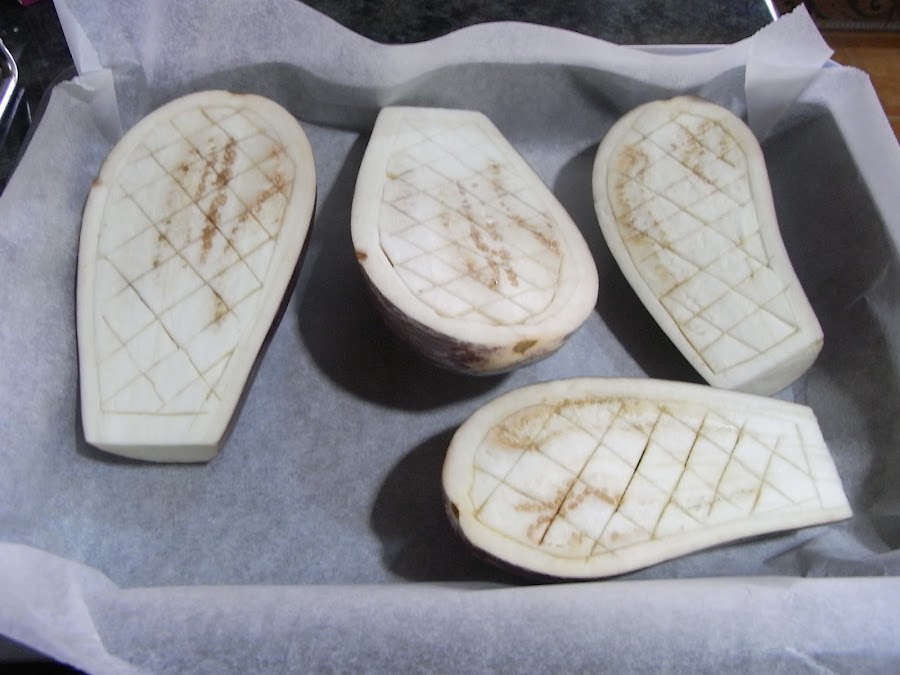 Lavamos las berenjenas, quitamos el pedúnculo y las abrimos por la mitad a la larga, Se les hacen unos cortes transversales sin llegar a la piel y se ponen en una bandeja apta para horno. Se meten en el horno caliente una media hora o hasta que la pinchéis y estén blanditas. Este paso se puede hacer al microondas pero yo lo hago al horno.