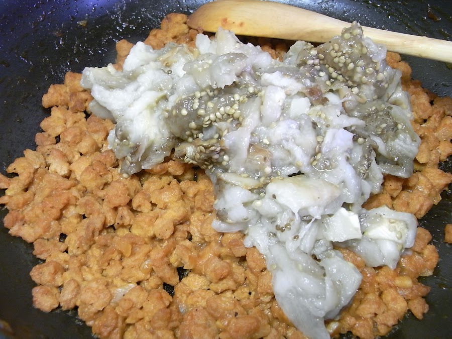 Picamos la carne de las berenjenas con un cuchillo para que quede suelta y se añade al sofrito de la soja texturizada.