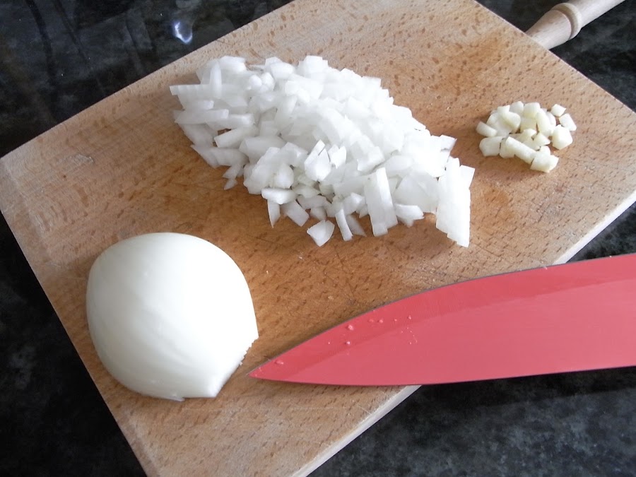 Cortamos una cebolla en brunoise (cuadraditos piqueños) y picamos 2 dientes de ajo.