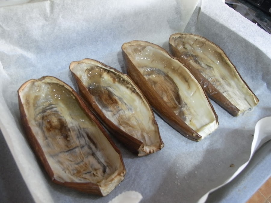 Cuando las berenjena estén asadas, se sacan del horno y se dejan atemperar para que cuando saquemos la carne no se rompan, hay que dejar la piel entera para después volverlas a rellenar.