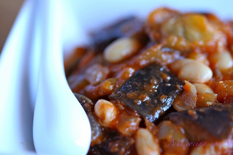Por último añadimos las alubias escurridas, mezclamos bien y dejamos cocer durante unos 40 minutos a fuego lento, vigilando que el guiso no se seque demasiado, si se seca, podemos añadir un par de cucharadas de agua.