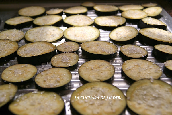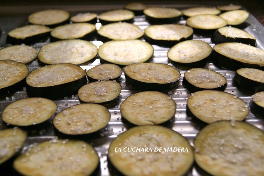 Lavamos la berenjena, cortamos las puntas, frotamos las puntas ,( primero de los trucos) de la berenjena en la tabla; cortamos en rodajas finas y ponemos sal gorda sobre ellas para quitar el amargor. Lo dejamos unos 15 minutos.