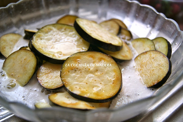 Vamos sacando las berenjenas del fuego el un plato con doble de servilletas para que absorba el aceite; volvemos a ponerlas altas, no planas, paras que escurran el aceite.