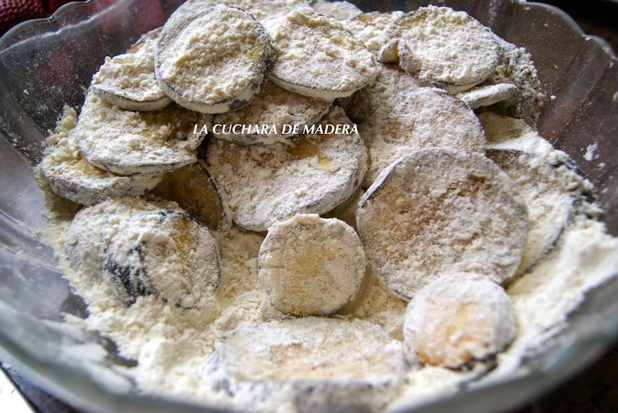Llenamos un bol con harina y vamos incorporando las rodajas, las pasamos por la harina y vamos colocando en un lateral , hasta acabar , este es otro truco, no las deja una sobre otra, así absorben menos harina.