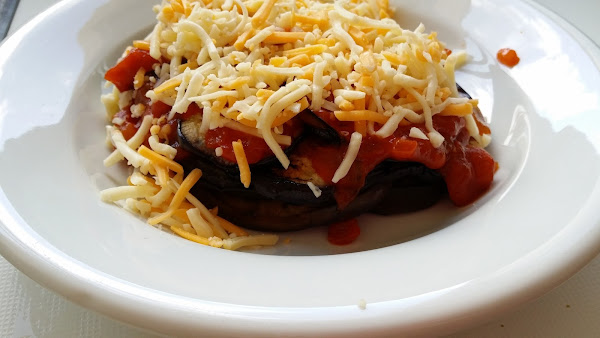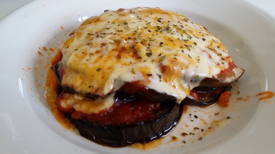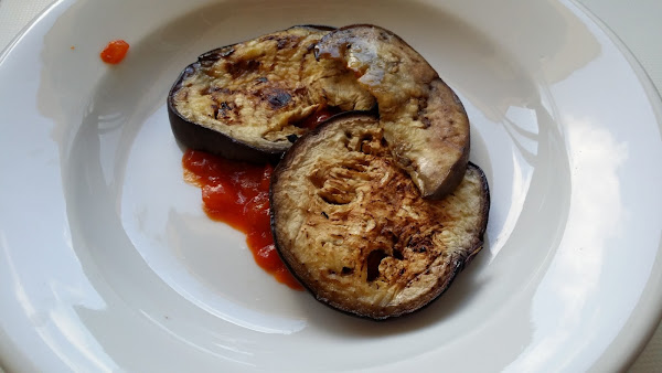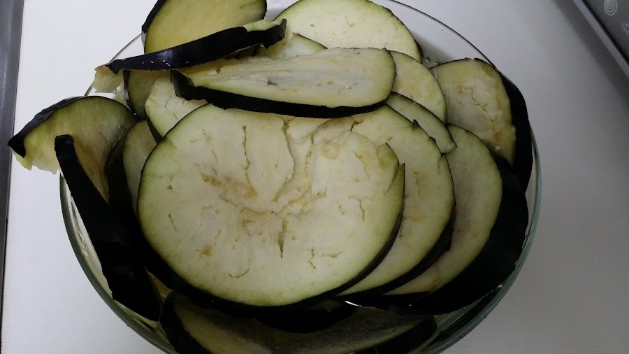 - albahaca y oréganoLo primero que haremos será lavar la berenjena, cortarla a rodajas del mismo grosor a ser posible y dejarla de 20 a 30 min en agua con sal.