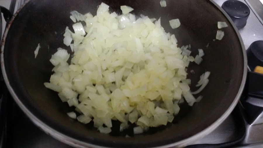 Mientras tenemos la berenjena en agua, picamos cebolla y la sofreímos.