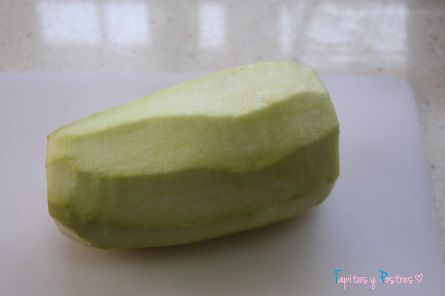 Lavamos y pelamos la berenjena. Cortamos los dos extremos.