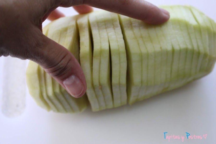 Hacemos los cortes en la berenjena con un cuchillo afilado sin llegar hasta abajo. Tengo que reconocer que tengo un aparatejo con cuchillas, especial para hacer el corte Hasselback, lo que es muy cómodo. Pero se puede hacer perfectamente con un cuchillo normal.
