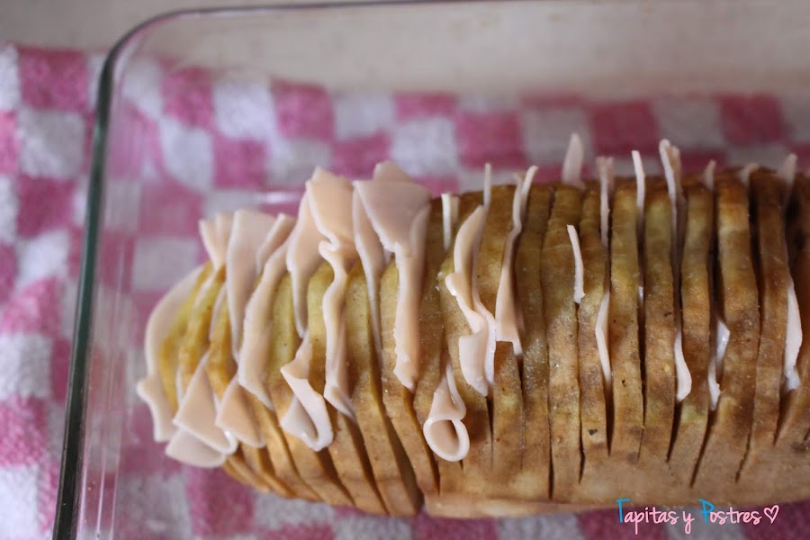 Cuando la saquemos del horno (con cuidado) dejamos que se temple y le metemos trocitos de pechuga de pavo entre rodaja y rodaja.