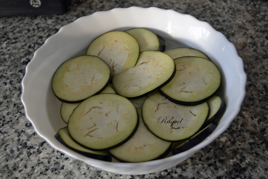 Las introducimos en un bol y esparcimos sal sobre ellas y añadimos agua, las dejamos quince minutos reposar y después escurrimos, eso se hace para que no amarguen.