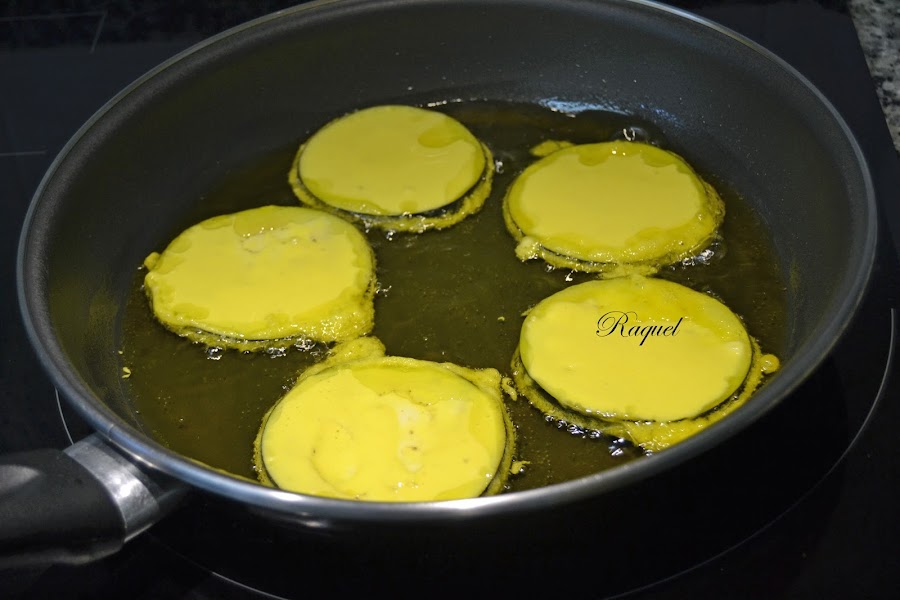 Ponemos una sartén con un buen aceite de oliva virgen y cuando este caliente iremos friendo las rodajas de berenjena, por ambos lados hasta que se vean doradas.