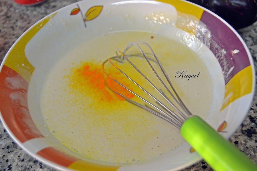 Vamos añadiendo a la crema del rebozado, las rodajas de berenjenas y las vamos untando bien.