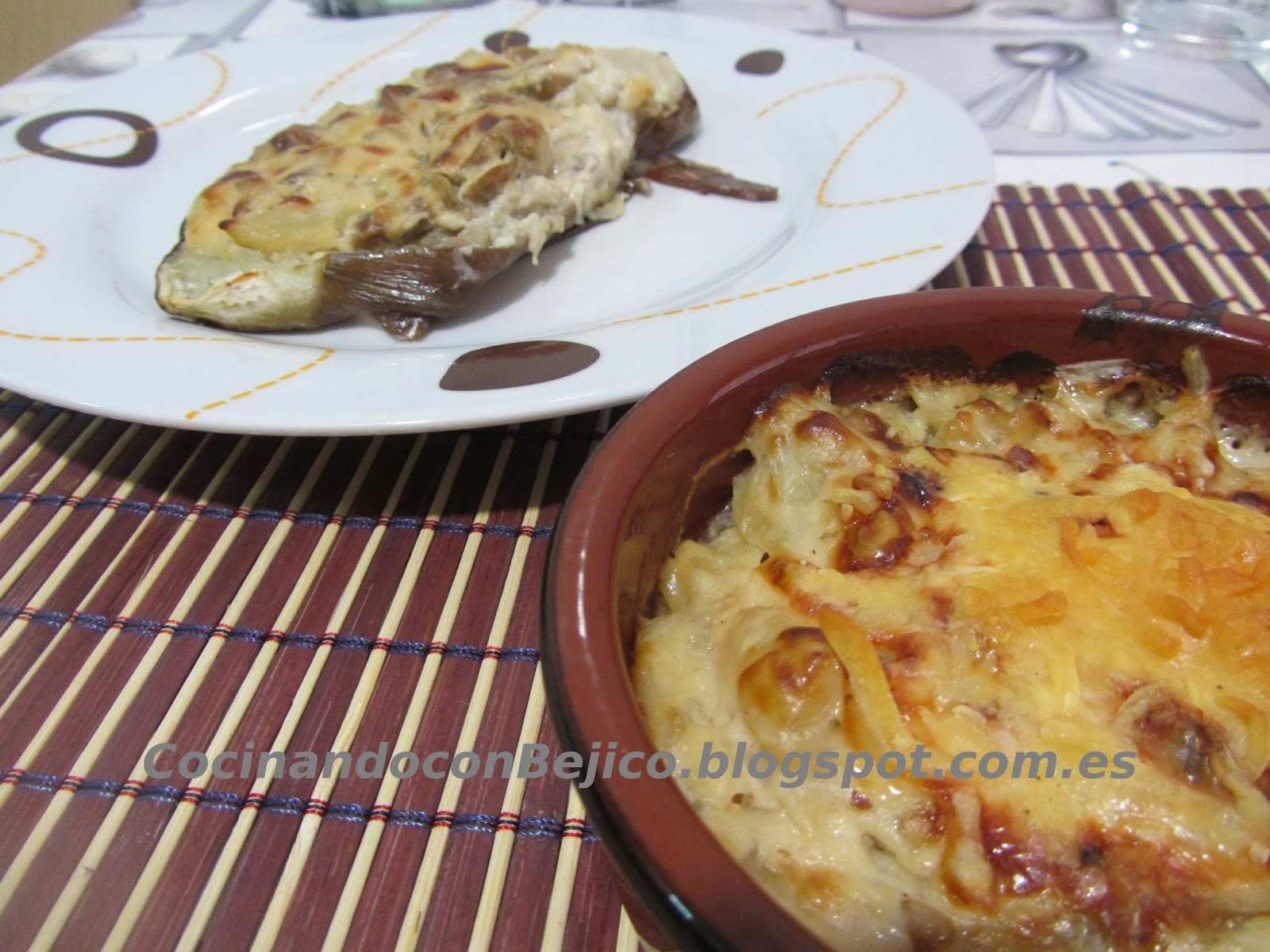 berenjena,cebolla,setas,nata (crema de leche),leche,queso,sal,aceite,pimienta,queso ralladoHace unos días que me apetecía comer berenjenas rellenas, así que ya que hoy el día ha salido lluvioso y nada favorecedor para salir a pasear, ha sido el día perfecto.