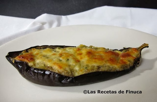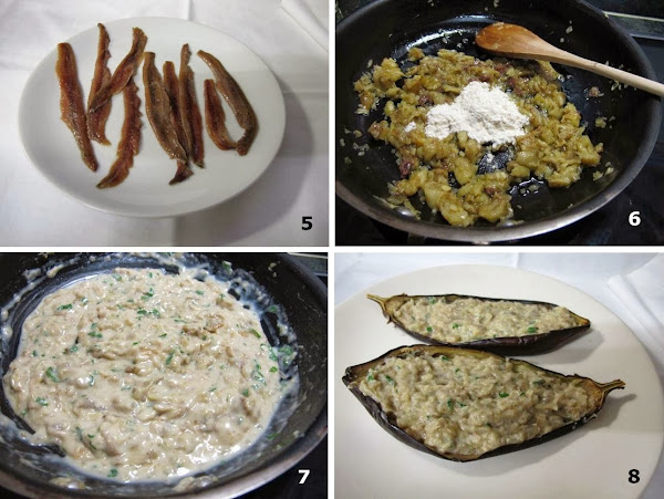 Picamos en trozos 4 anchoas de lata y si tienen alguna espina se la quitamos. Ponemos en la sartén. Añadimos un poco de pimienta negra molida. Echamos una cucharada sopera de harina (rasa) y revolvemos para que la harina se tueste un poco. Vamos añadiendo leche poco a poco hasta conseguir una bechamel no muy espesa. Cuando esté a nuestro gusto añadimos una rama de perejil picado pequeño y revolvemos bien. No suele ser necesario poner sal pues con las anchoas es suficiente. Colocamos la mezcla en las cáscaras de la berenjena.
