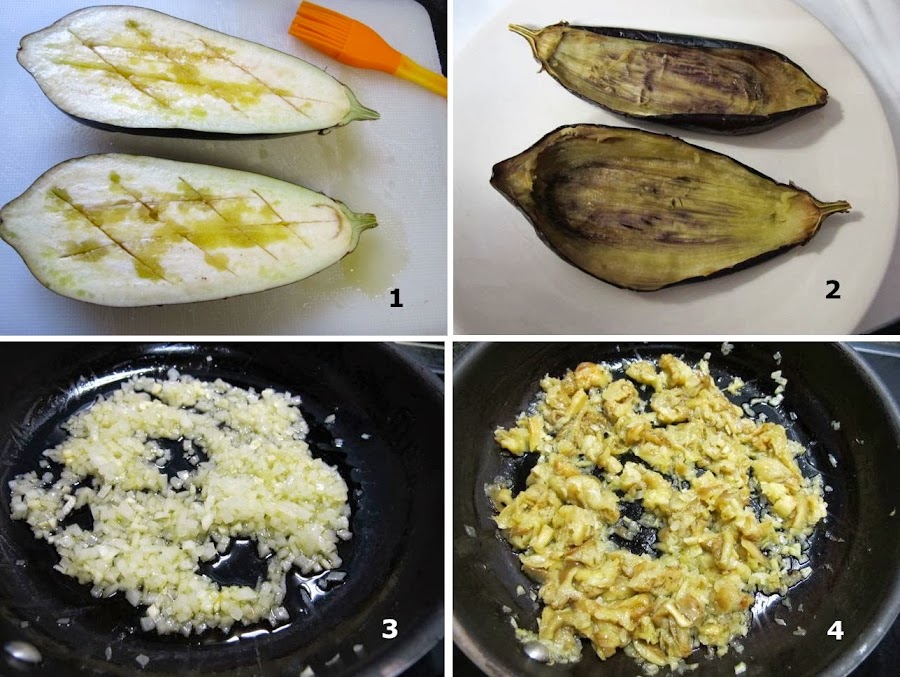 Precalentamos el horno a 180º. Con un cuchillo afilado y con cuidado de no cortar su piel hacemos unos cortes en la carne de la berenjena y aceitamos ligeramente. Colocamos en una fuente para horno e introducimos en el mismo. A los 30 minutos pinchamos con un palillo para comprobar si está blanda. Si es así, sacamos del horno y dejamos templar para no quemarnos al vaciarla. Mientras, en una sartén ponemos a pochar la cebolla y el ajo con un poco de aceite, a fuego bajo. Con ayuda de una cucharilla vaciamos la berenjena y cuando nuestro sofrito esté bien hecho añadimos la carne de la berenjena a la sartén. Revolvemos bien y dejamos que se haga 5 minutos.