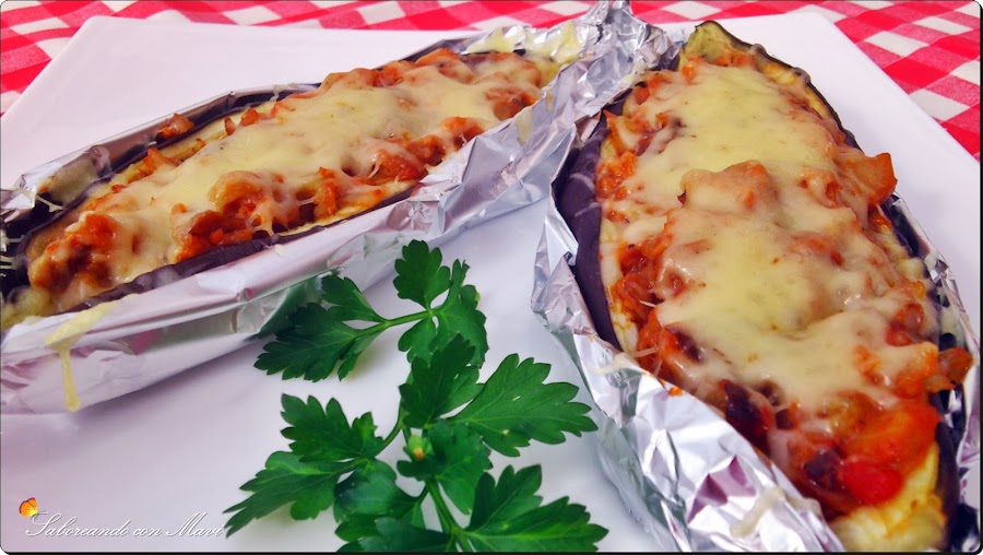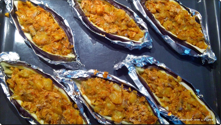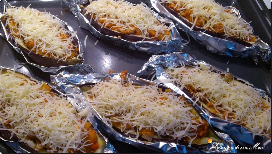 Mientras se hacía todo fui forrando las mitades de berenjenas con aluminio como barquitos.