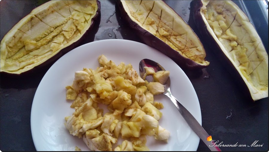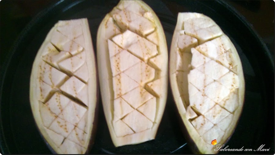 Partir las berenjenas por la mitad y hacerles unos cortes sin traspasar la piel como veis en la foto.
