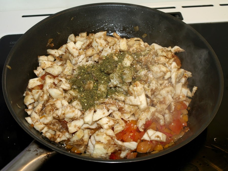 - Cuando el tomate empiece a reducirse añadimos la carne de berenjena, un poco de sal y el za"atar y seguimos cocinando hasta que esté todo bien hecho.