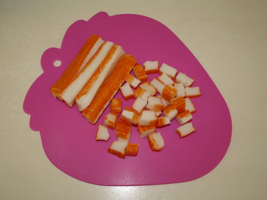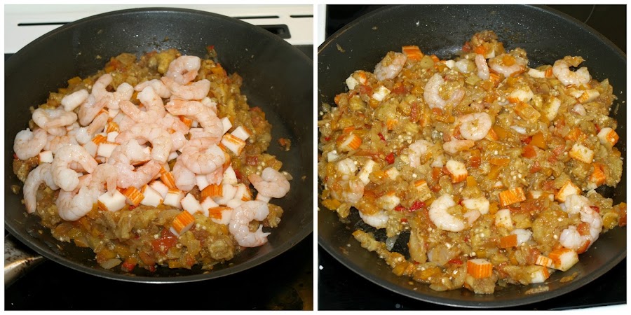 - Por último añadimos el surimi y las gambas, mezclamos bien y dejamos un minuto más. Retiramos del fuego y dejamos reposar unos minutos.